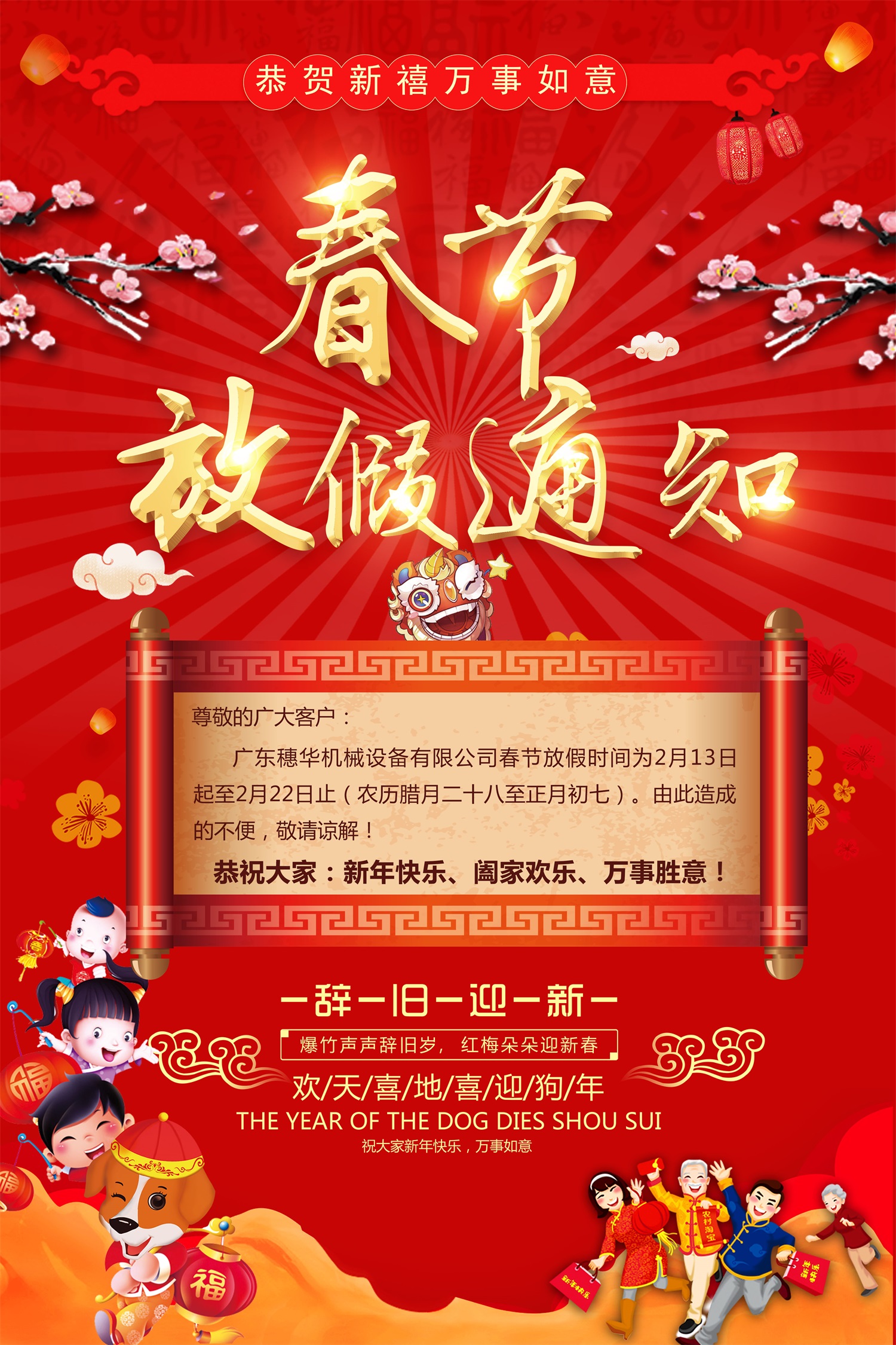 廣東穗華食品機(jī)械2018年春節(jié)放假通知