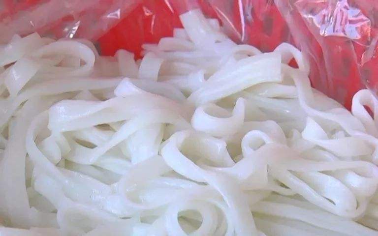 與尋常米粉不同,這種河粉呈現(xiàn)出扁寬的長條形,與大多數(shù)米粉一樣,河粉的原料也是稻米。將稻米磨成漿后再用河粉機(jī)蒸成薄粉皮,然后切成條帶狀便成了河粉。河粉色澤雪白,看上去略微有些透明。