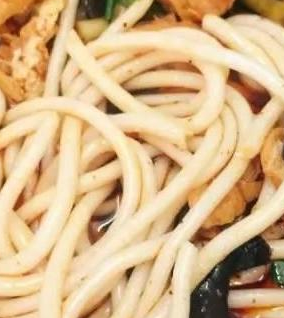 原料:切粉100克,鹵牛肉25克,香菜5克,炸黃豆10克,炒香的辣椒粉3克,骨頭湯100克,鹵水50克。